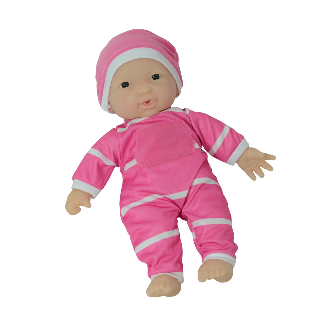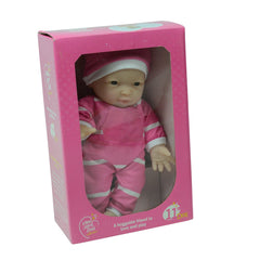 - The New York Doll Collection Realistically Looking Asian Soft Baby Doll with Amazingly Detailed Vinyl Head, Arms, and Legs Dressed in a Pink and White Onesie and a Sweet Little matching Hat. The Asian Doll has Brown Eyes.