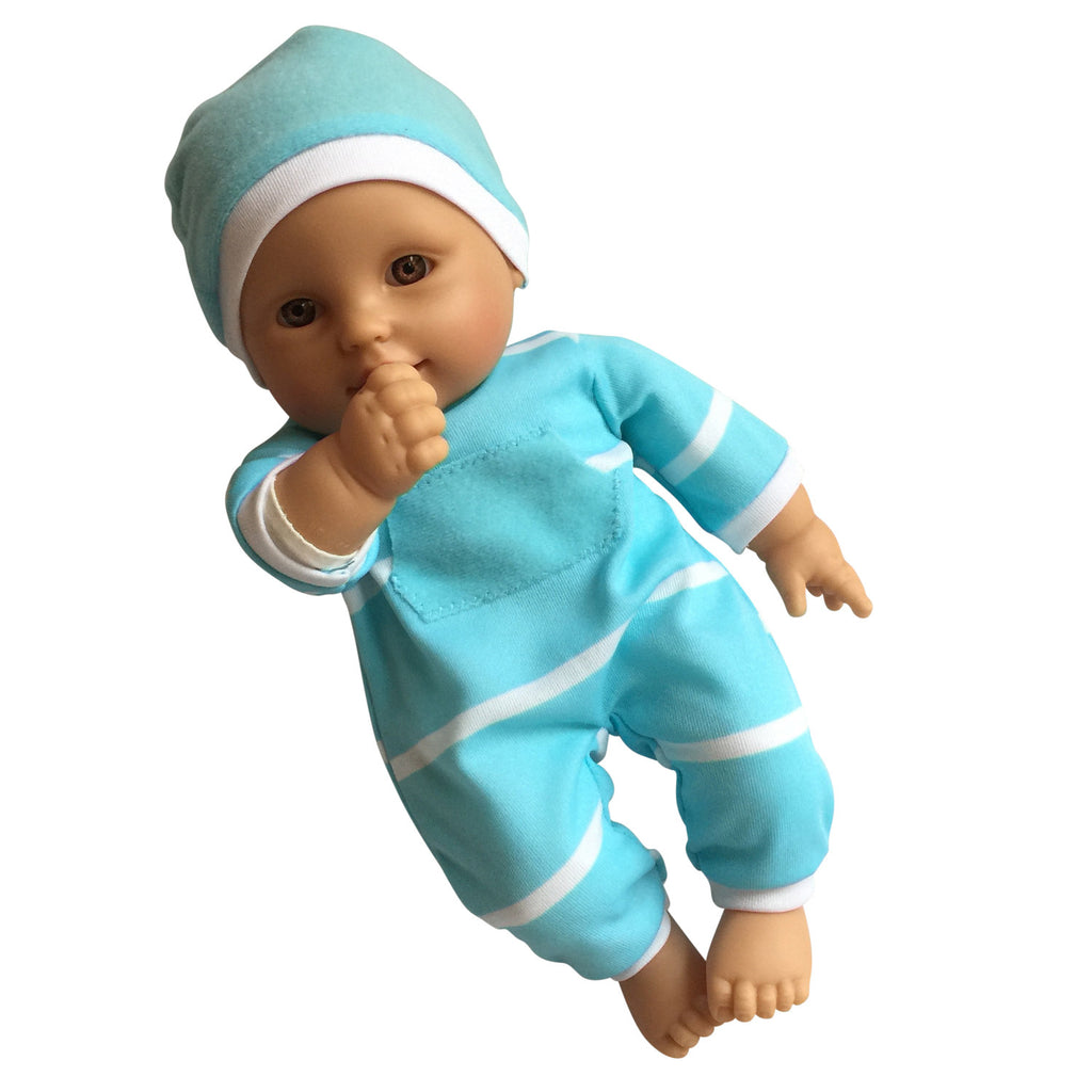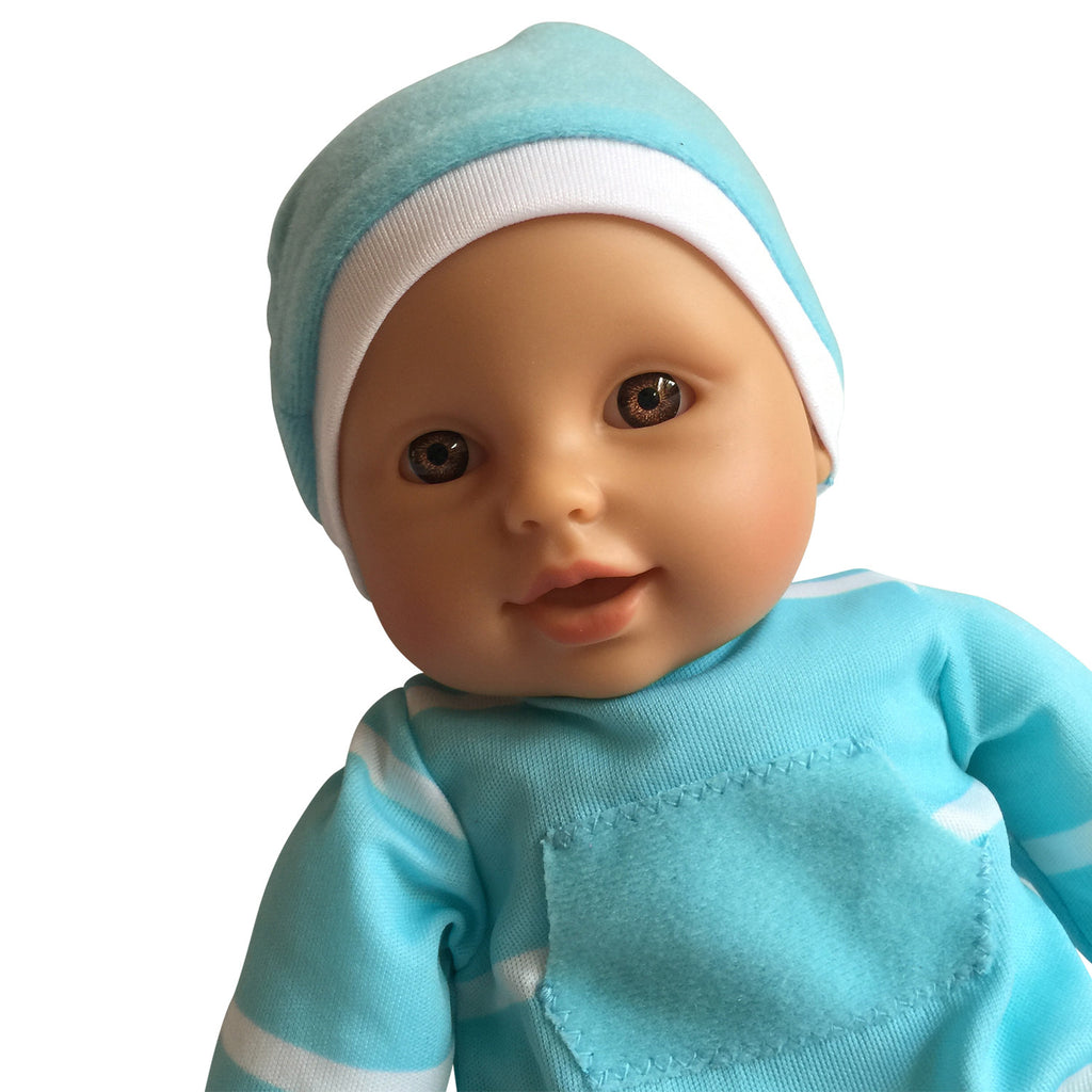 - The New York Doll Collection Realistically Looking Hispanic Soft Baby Doll with Amazingly Detailed Vinyl Head, Arms, and Legs Dressed in a Light Blue and White Onesie and a Sweet Little matching Hat. The Hispanic Doll has Brown Eyes.