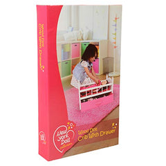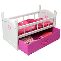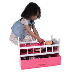 The New York Doll Collection's elegant White Wooden Doll Crib with Storage Drawer will be the center of attention every bedtime and again in the morning when it's time for dolly to get dressed for the day's adventures! Fun for little mommies caring for their pretend, tired children; or an elegant way to display prized collector dolls. This white crib with a storage drawer features beautifully painted pink hearts. Sleepy dolls will slumber in comfort thanks to the padded pink with white heart printed bedding with matching pillow. Storage drawer is removable. Fits 18 inch dolls such as American Girl, Madame Alexander and Our Generation. For children from three years old and up. Bed is made with wood and durable wood composite board with a white finish. Spot clean the fabric bedding as needed. Wipe the frame clean as needed with a lightly dampened cloth and dry thoroughly. Spot clean the drawer as needed. Adult assembly required.