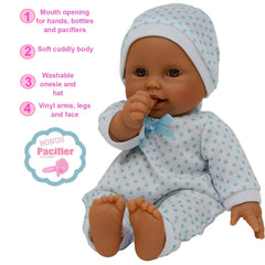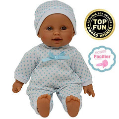 - FREE DOLL PACIFIER INCLUDED - Hispanic Soft Baby Doll with Amazingly Detailed Vinyl Head, Arms, and Legs. This BABY DOLL comes Dressed in a Polka Dotted Onesie and a Sweet Little matching Hat.