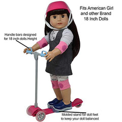 18 Inch Pink Doll Scooter includes Doll shoes, Elbow and Knee pads, Scooter and Doll Helmet. Handle bars are designed for 18 inch dolls to stand by themselves.