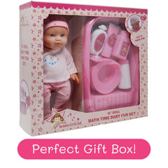 - INCLUDES 12” VINYL BABY DOLL: Made out of extra durable vinyl, our bath time dolls for girls are splash-proof, easy to clean & reliably wear-resistant. Though not suitable for full submersion, the 12 inch toy doll can be dunked, splashed or misted with water if the cloth outfit & cap are removed. What a yummy feeling to cuddle a freshly bated dolly!