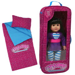 9 Piece Set Includes: Doll Traveling Case with Pockets, Doll Sleeping Bag, Pillow, 18 Inch Doll Pajamas, Fuzzy Slippers, Teddy Bear, Eye Mask, Story Book and a Game