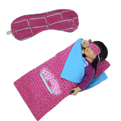- 9 piece set includes: doll traveling case with pockets, doll sleeping bag, pillow, 18 inch doll pajamas, fuzzy slippers, teddy bear, eye mask, story book and a game
