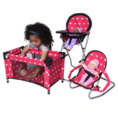 This Mega doll playset includes a highchair, Bouncer and pack N play for dolls. Little girls will enjoy endless hours of fantastic pretend play fun with this Super value set. Pack N play dimensions: 12"x21"x12"; high chair dimensions: 12"x6"x24"; Bouncer dimensions: 14"x10"x15". Highchair is foldable.