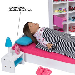 The cutest addition to any doll collection. Authentic doll sized working alarm clock. Set the alarm and dolly will never be late to school again. Manufactured by The New York Doll Collection, quality doll clothing and accessories for 18 inch dolls.