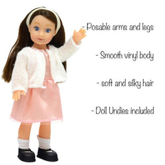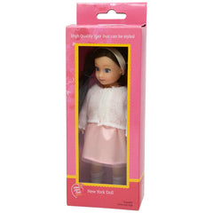The 6.5" (16.5 cm) mini doll has painted eyes and soft silky hair. Her smooth vinyl limbs are posable. She arrives in a tiny version of the 18 Inch New York Doll Collection Dolls. The Handmade dresses are sewn to perfection and attention to details. The Doll comes with undies, as well as a headband, socks, and shoes. They have all the detail of the larger dolls, but are less expensive and take up much less room. The Mini Dolls are the Perfect size to take with you on trips as well as perfect for dollhouse play! Collect them all….